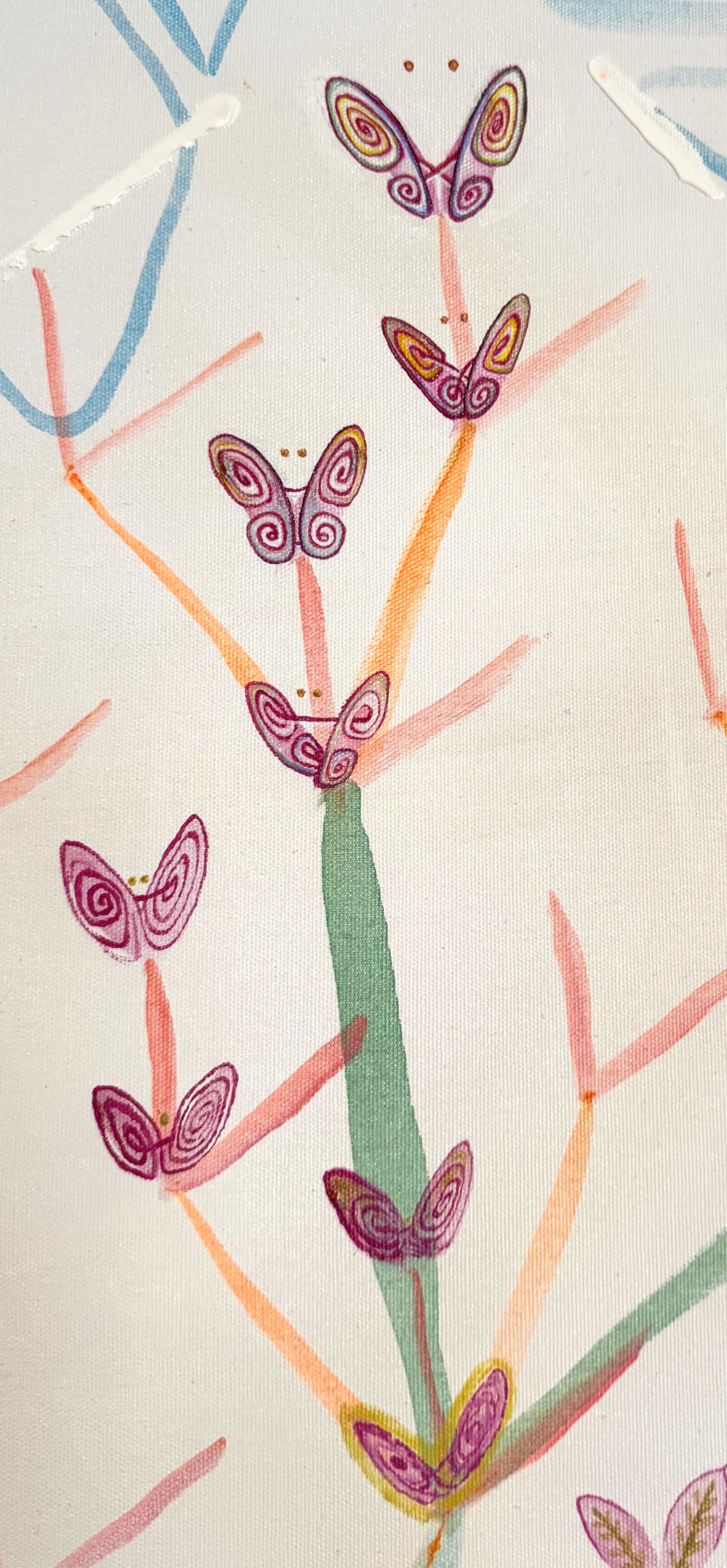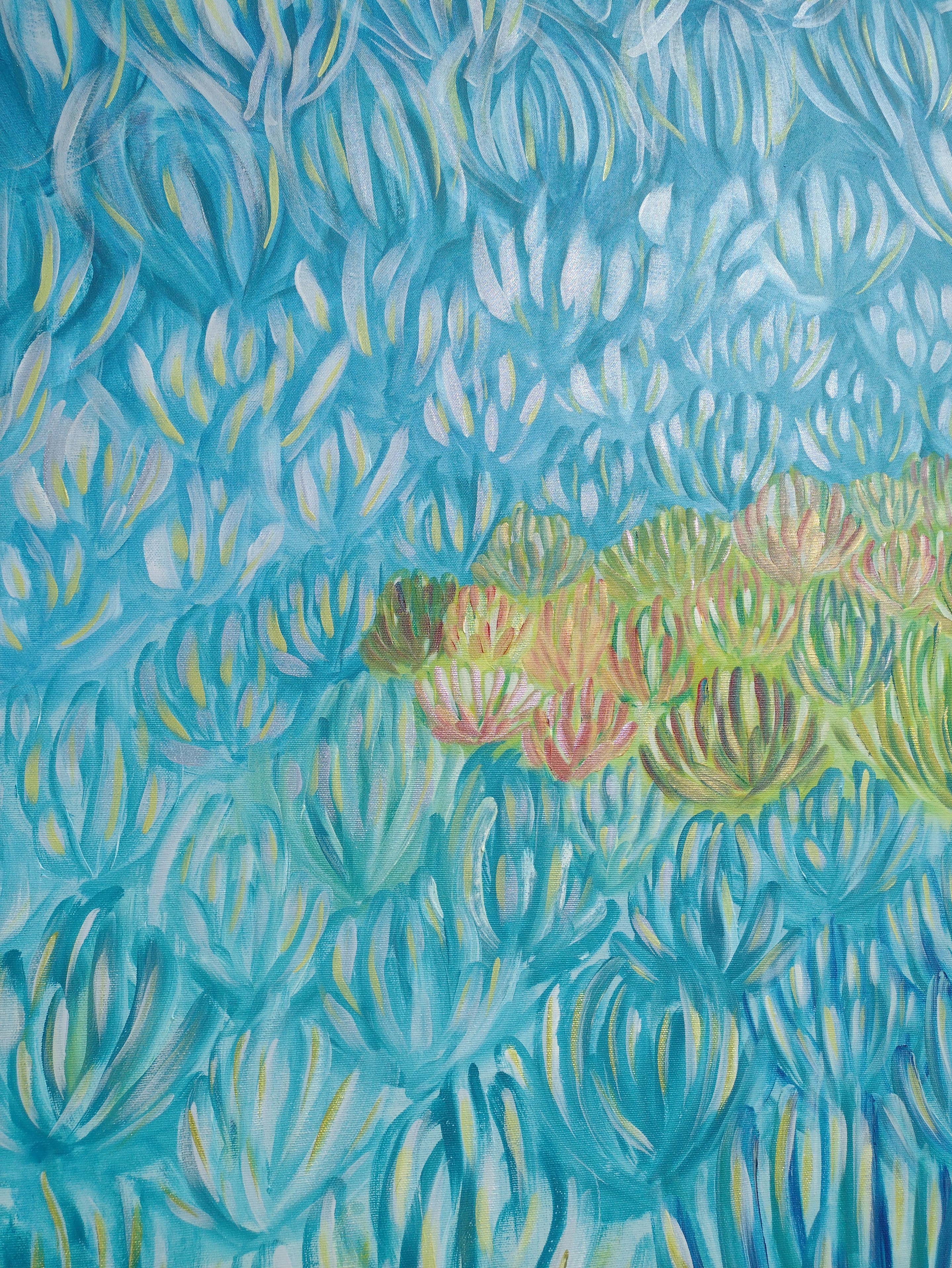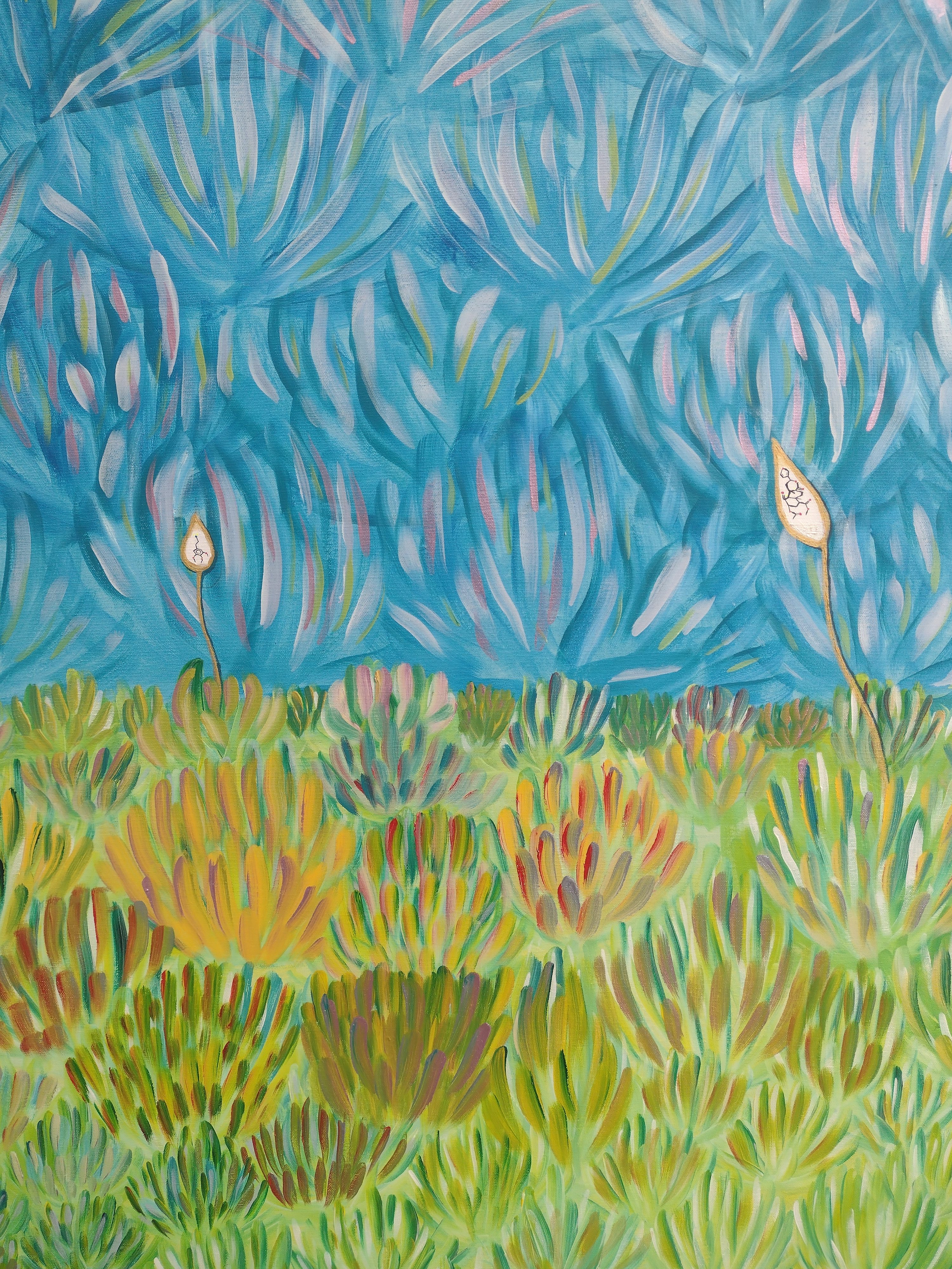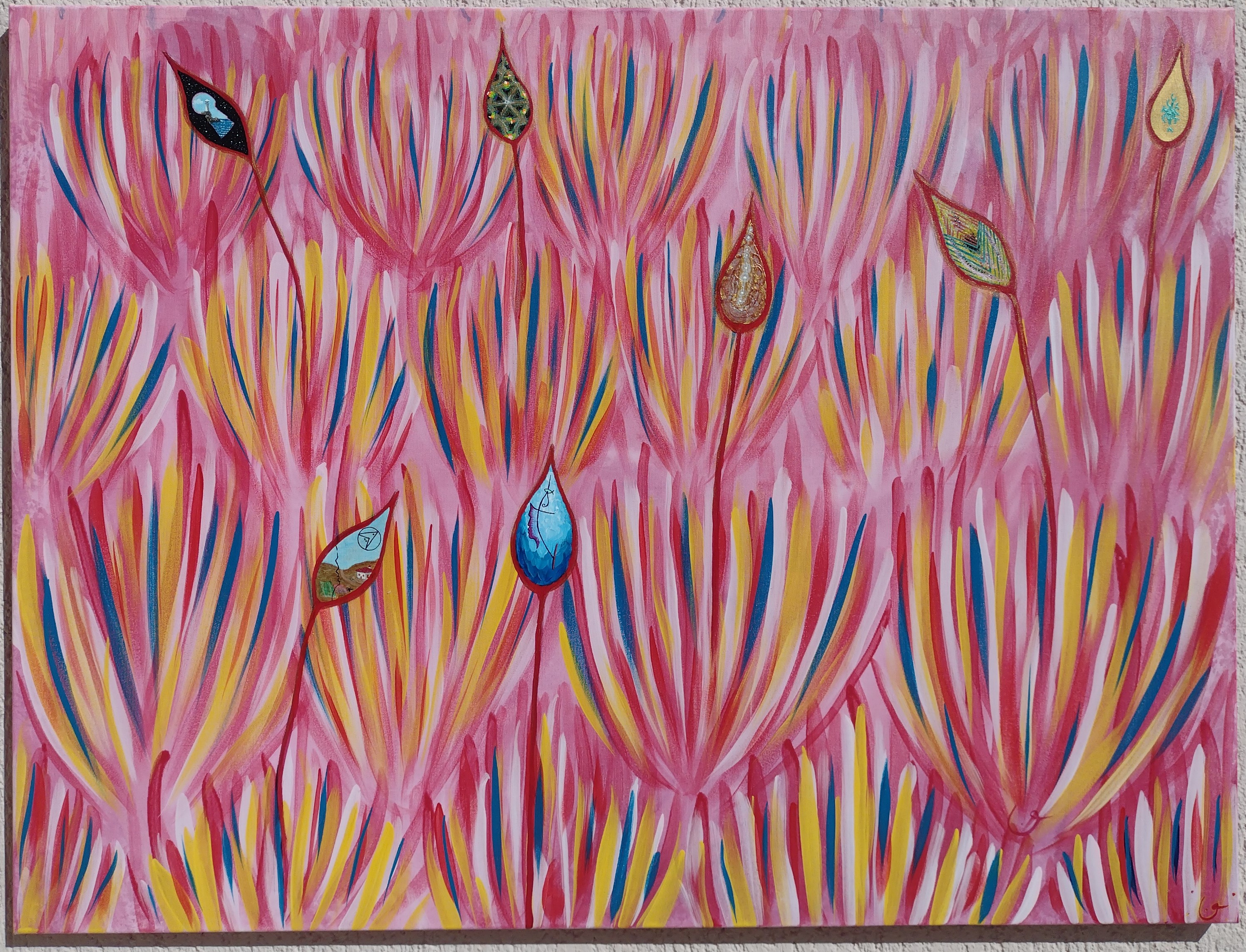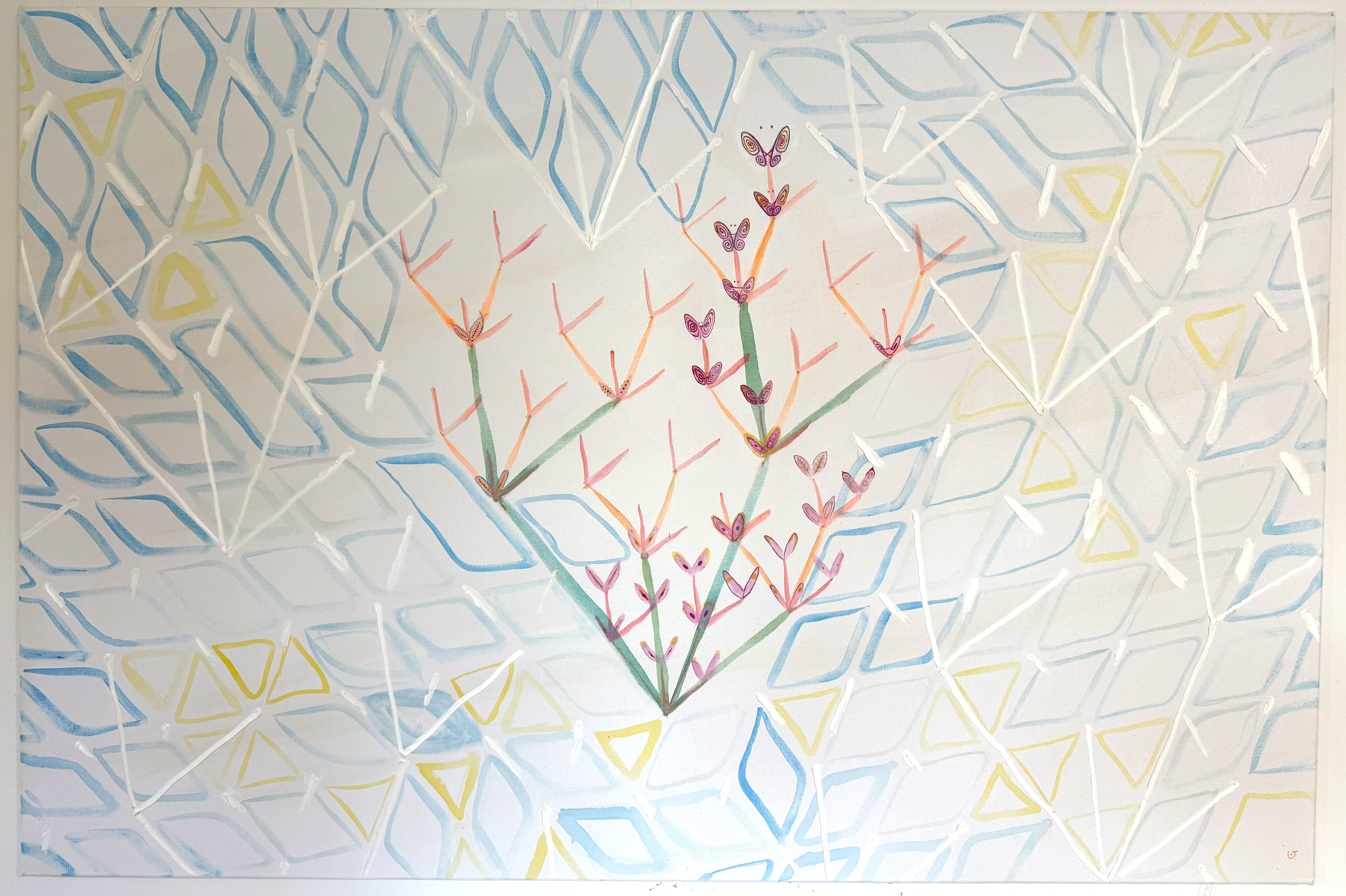 Made to accompany office employees in their daily tasks, great care has been taken to match the color of this artwork to the dividers of the desks. This piece, part of the collection of paintings in my signature style, blends a perceived “sky” to a “ground” by bringing both in a simpler space in the last painting. My regular flower figures are placed intentionally on background ones that seem to live on a different plane, to evoke continuity and inheritance. The flowers are bend as to indicate a breeze and an intention to communicate.