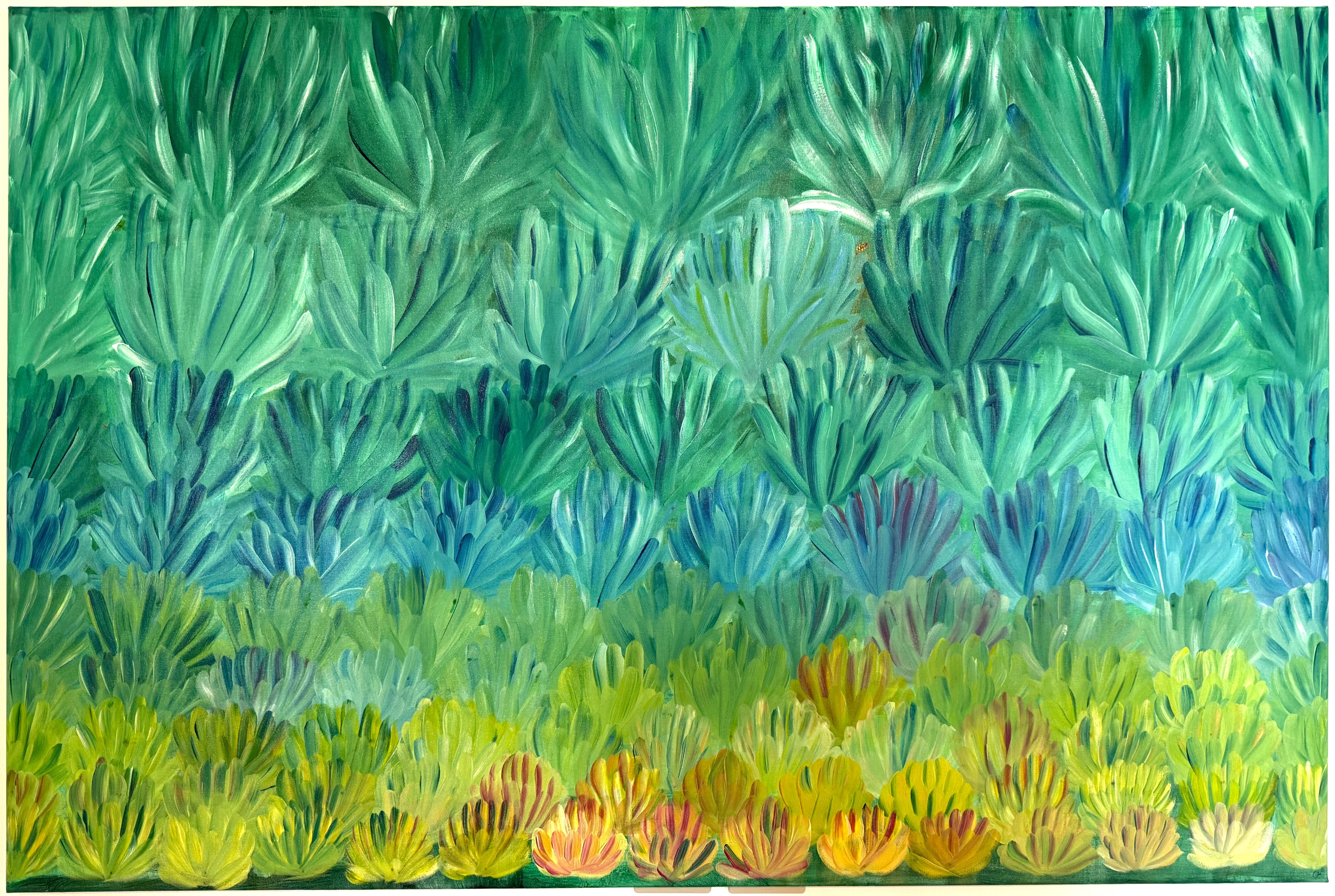 This large piece is my main contribution for the new HR office space. A continuation of “Marry me midnight”(3), in which perceived sky and earth are populated by the same flora, here I explore in more detail the space and it’s wrappings. Attention is given to not adhere to a particular perceptual dimensionality, and to match the colors used in the new offices. The structure of this space is enhanced by using particular colors in the leaves to expand the lineages of the plants from the earth to the sky and back again, so the viewer is advised to follow color through the painting.