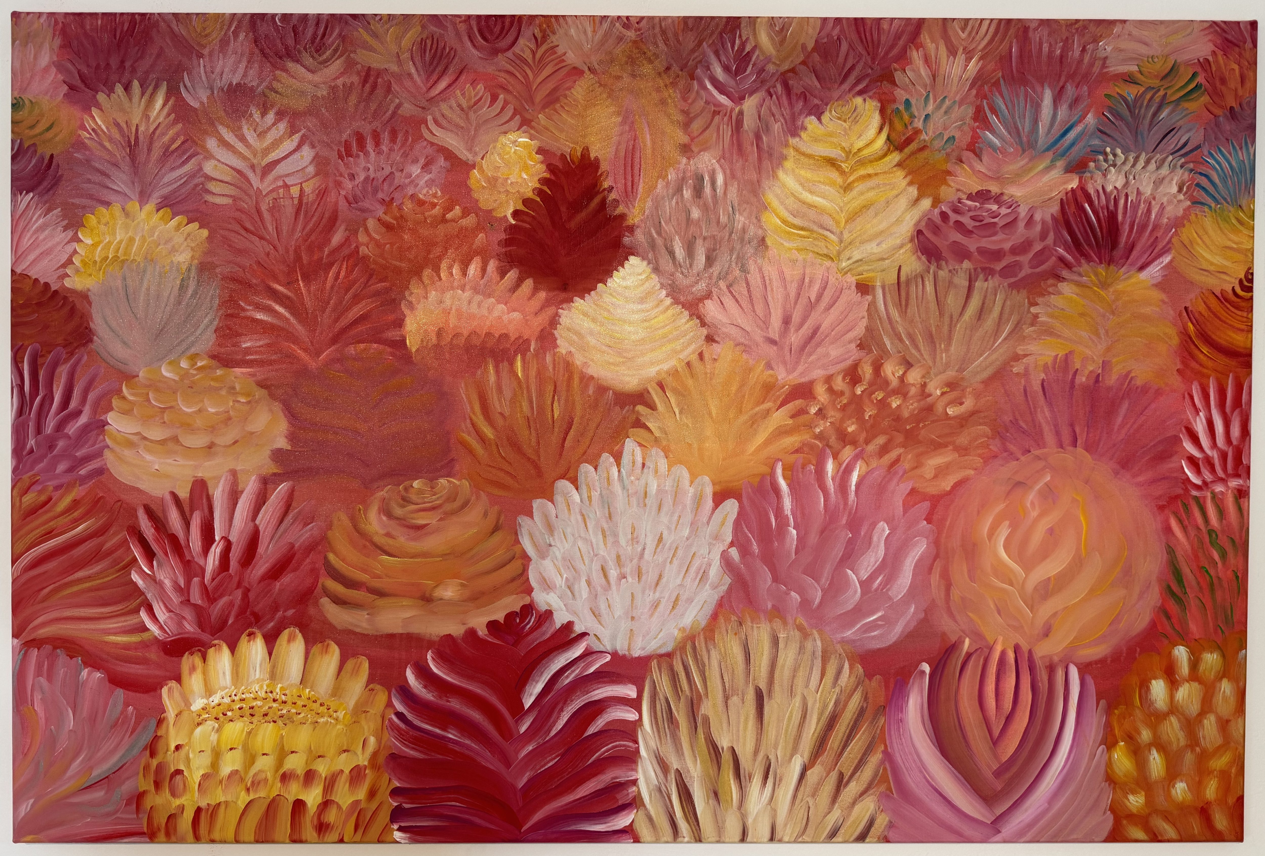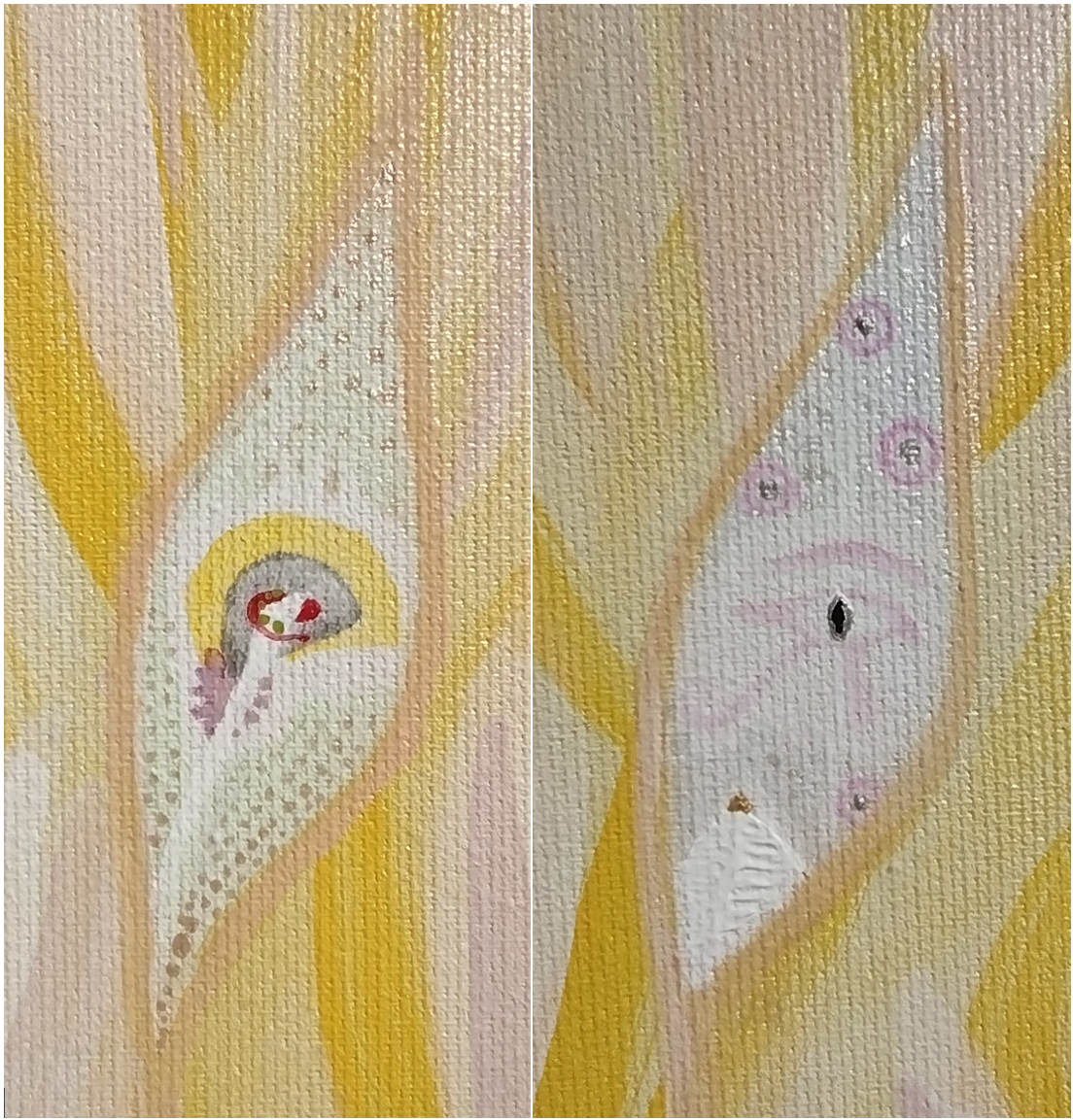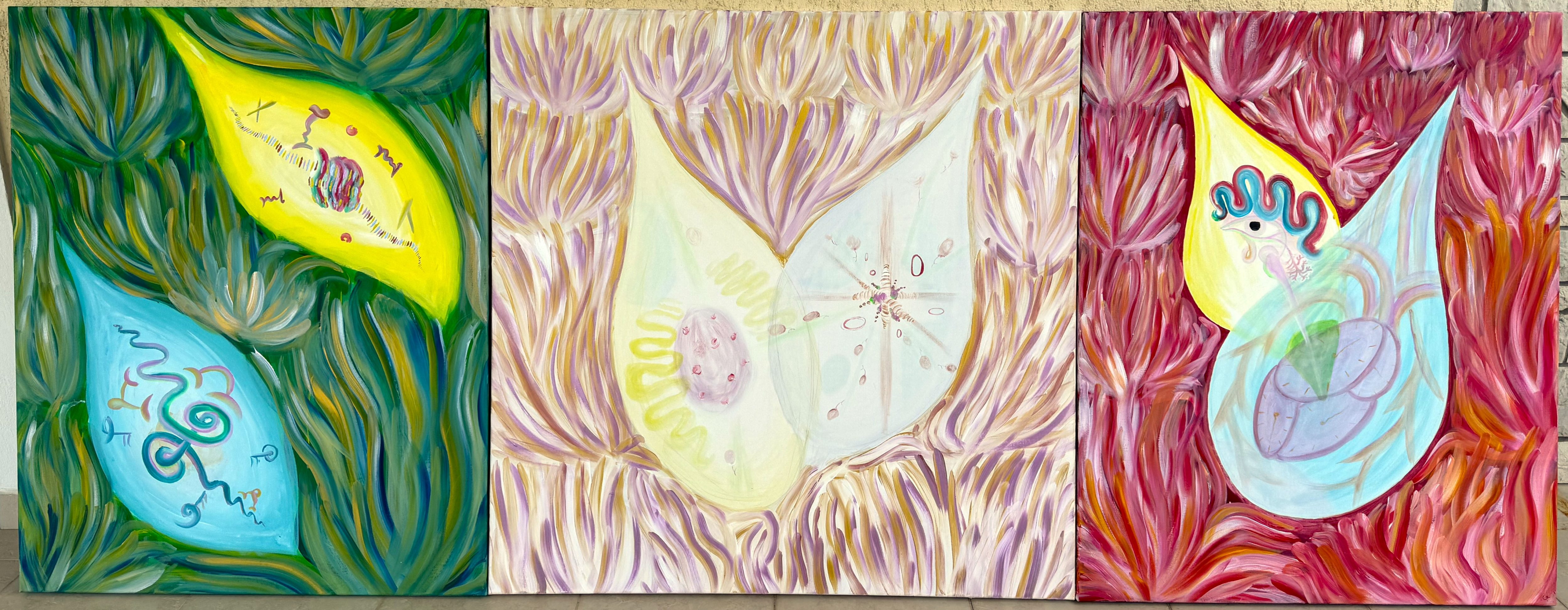 By inviting the viewer to come closer and inspect the inset new worlds, the triptych in the cafeteria alludes to the act of microscopy and the need to have no preconceptions in order to understand biology. Also, by presenting many flowers with different inner worlds together placed in fields, I aim for this work to mirror the social nature of the cafeteria and to celebrate interesting people sitting down together to have lunch.