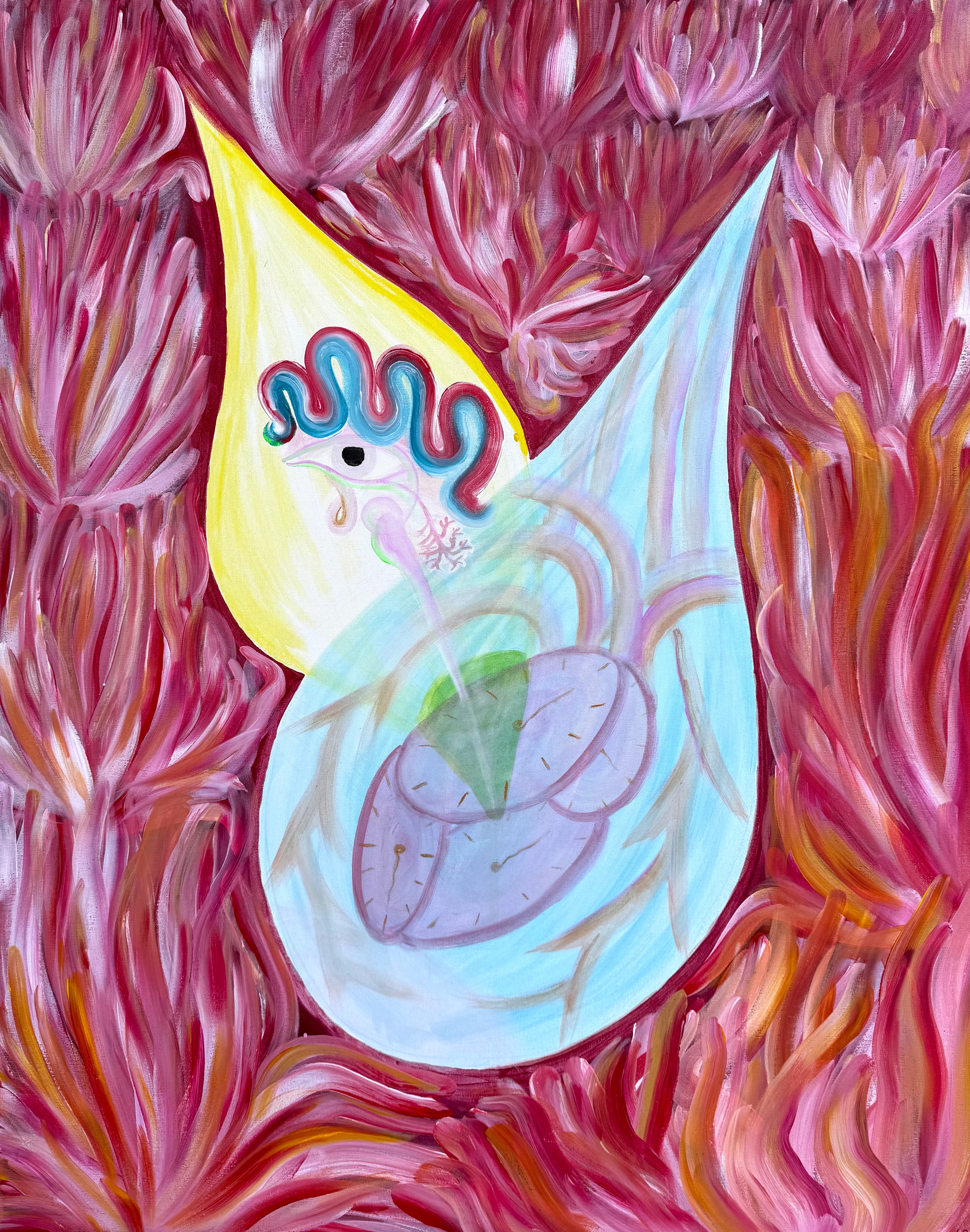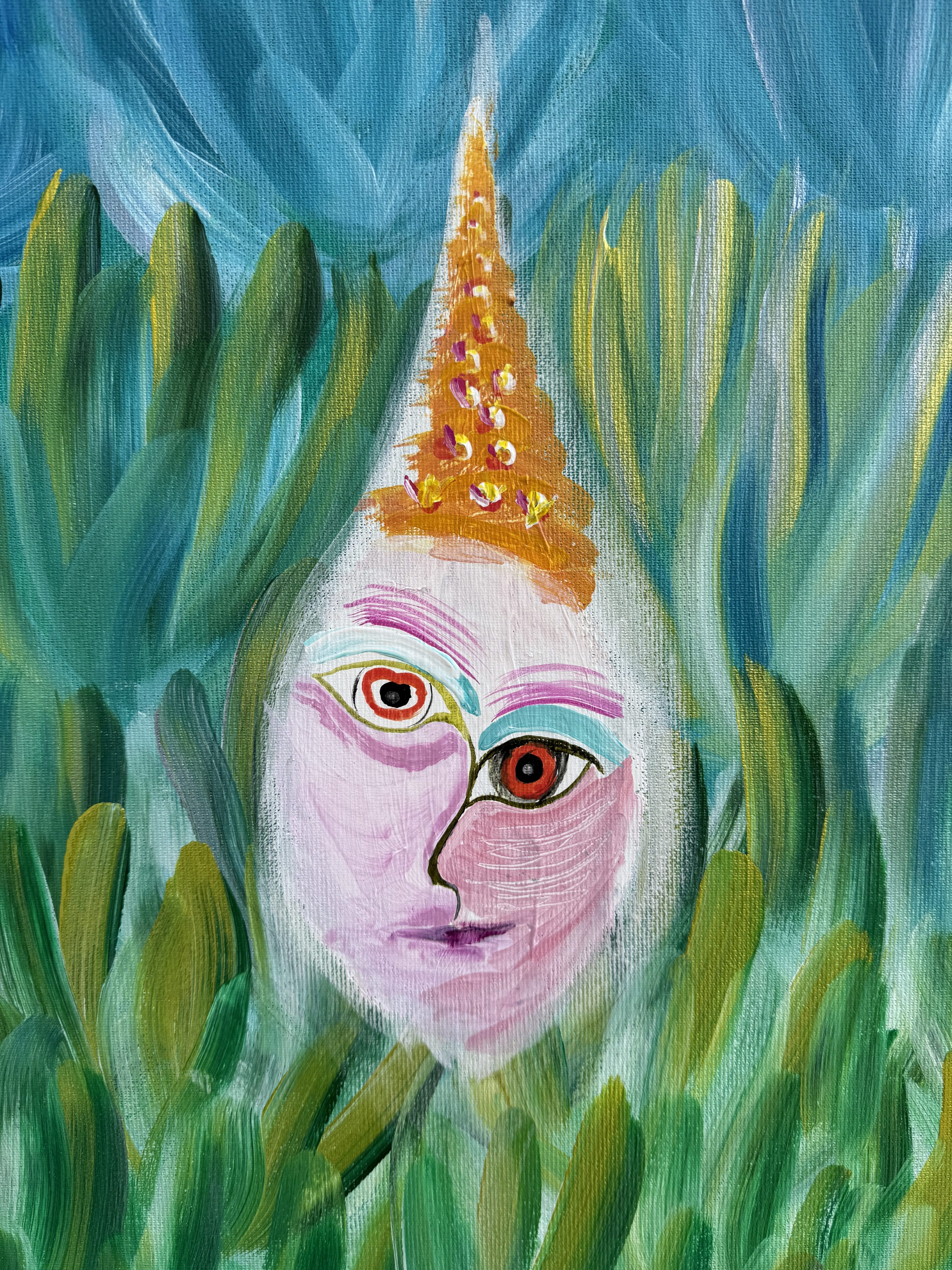 In this piece I visit my signature style of a Stipagrostis flower with inset micro-painting, but for only one “portrait” flower. I made two flowers on the same undulating field, each on its own canvas. One of them was chosen by the Creative Director to serve as the key to the Italfarmaco collection of paintings. The color red was purposefully matched to the office inner garden tile façade, and the style of the field to “marry me midnight” triptych, both visible behind it. The flower’s inset makes apparent a human face, in order to give another layer of interpretation to all the flowers in my oeuvre, that of particular personalities and their thought-spaces, hence the name “1 key”. The portrait chosen follows a simplified Picasso style, but the form resembles a growing seedling.