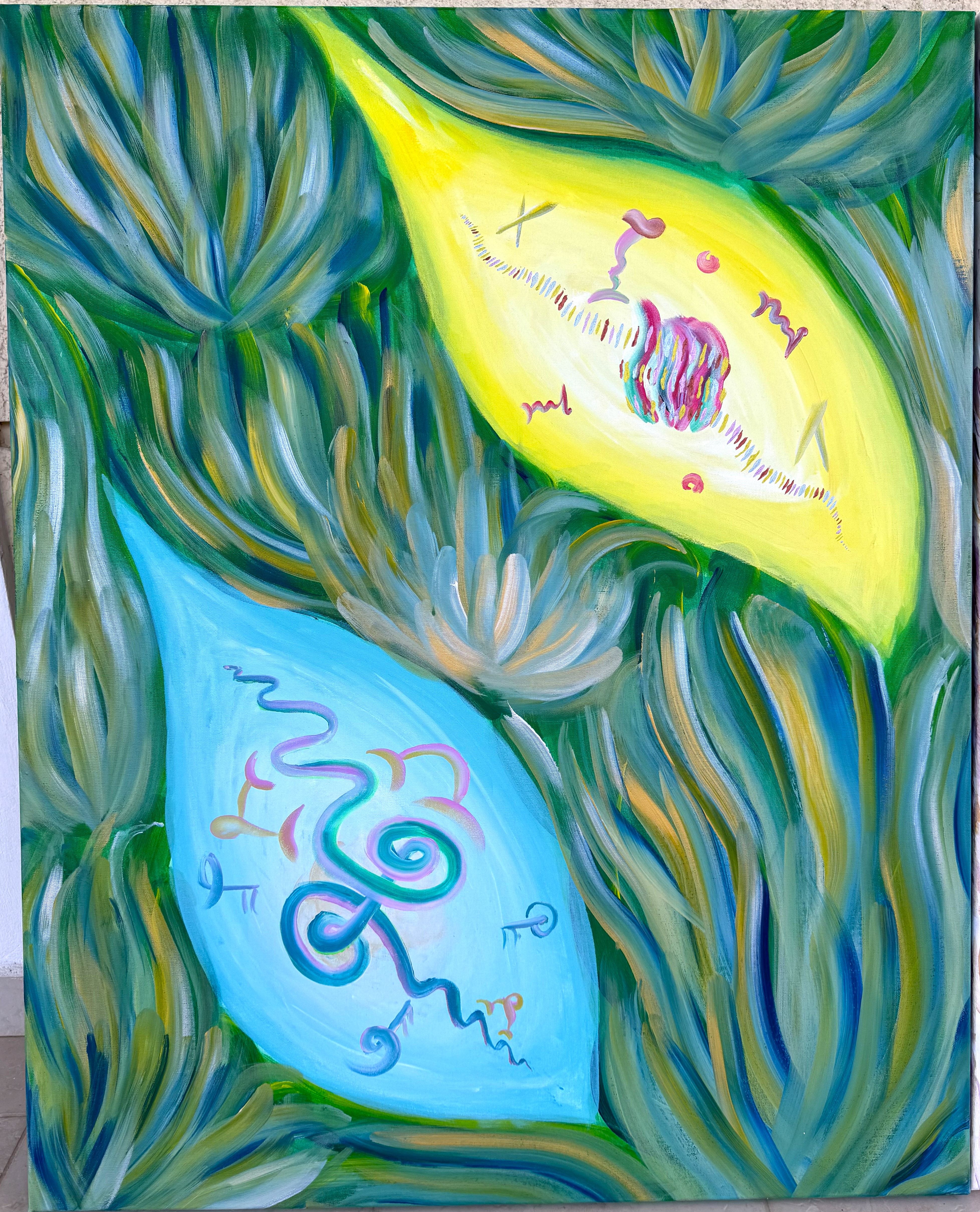 Introduction: Bridging art and science is the express purpose of my work as an artist. I feel that the themes explored by science are of extreme interest to contemporary art. Artists cherish new perspectives into the human condition. Likewise, scientists want to celebrate their change in understanding of our cosmos, and are delighted to see this depicted in art. Yet often neither the dedicated scientist nor the artist has the aptitude or time to understand each-others work. I have spent many years as a highly trained scientist. I have performed MSc, PhD and PostDoc level work in the areas of Theoretical Biology, Bioinformatics, Plant Molecular Biology and Biotechnology, Mathematical Morphogenesis and others, in many highly performing labs across Europe. During this time, artists, looking to understand contemporary biology as to inform their art, approached the wet and dry labs I worked in. Collaboration in most cases was difficult to bear fruits. At the same time, I felt constantly the urge to express, using art and technology, principles that arise as important in the scientific endeavour to understand Life, and have been formally painting for decades. That is why I strived to produce art and collaborate with artists throughout my academic career and decided to venture into art myself as a professional the last 7 years. Creating this collection of works for Italfarmaco has been a fantastic opportunity to support, in my way, the important work done by Life Sciences professionals, something I always wanted to do.