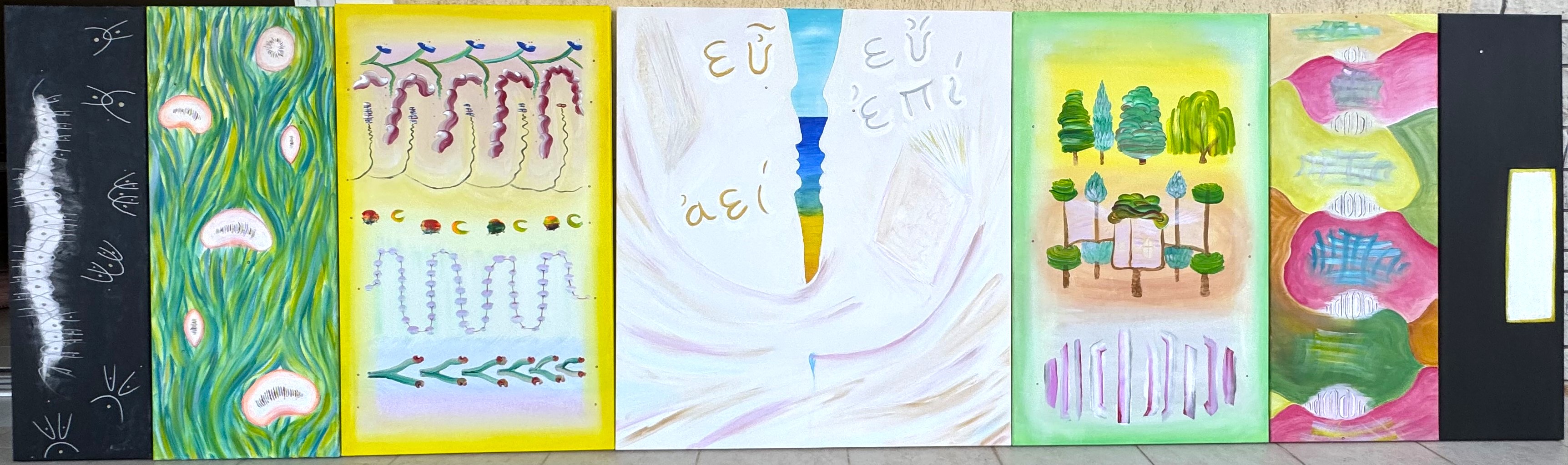 In the central canvas, the sentence “εὖ ἀεί” is juxtaposed to “εὔ ἐπί”. The first sentence loosely translates from Greek as “well/good, always” and the second sentence was meant to imply “εὕρηκα (Eureka!), on top”. The two sentences were chosen to be similar yet not identical in their spelling, so as to imply the similarity of language expanding its meaning to the copying and diversification of other life modalities, like the DNA. At the same time the sentences wish to the viewer for him to be always in a good/healthy state as well as a productive/build-on-top state.