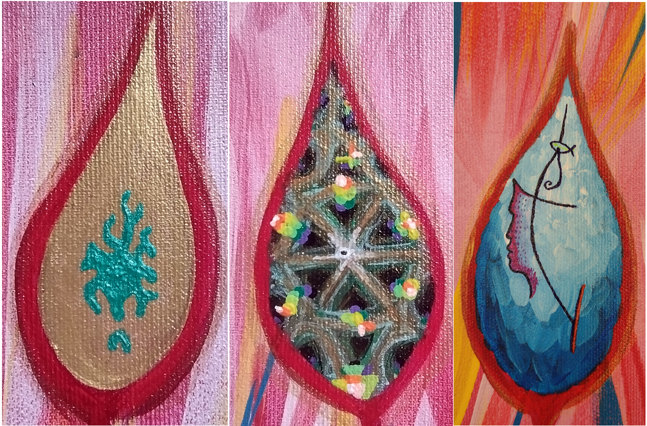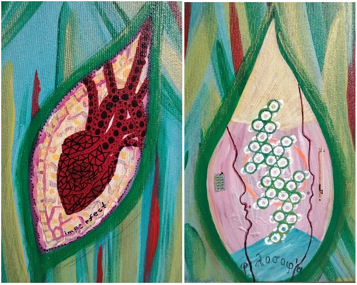 We can discuss the two micro-paintings closer to the viewer to indicate intentions: There is a heart painted in the style of Yayoi Kusama that celebrates her life and contribution to art and philosophy. The words “imperfect” and “PERFECT” can be read in the surrounding lattice world and the heart lattice respectively. In the neighbouring micro-painting, a pair of philosophers/strings discuss a mathematical object of propagating circles (see Chapter 2 of my Antithesis). A card of pills and a Violin bow are hanging on the walls.