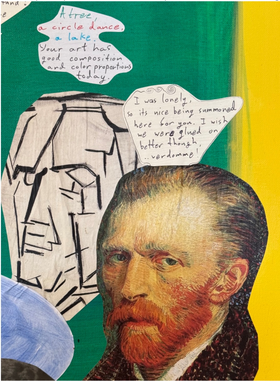 This is a complex, multi-layered piece. The background is painted in the style of Mark Rothko and alludes intentionally to “Italfarmaco Green” and to the signature Red tiles of the via dei Lavoratorio exterior façade. In this alluded space, I have placed prints of the original “Selfies”, self-portraits of famous artists, around a warped blue table/whirl. The artists are presumed to be in a conversation with the viewer, as to give feedback on what the viewer has submitted for appraisal. The artists explicitly refer to another work, a “meta-work” if you like, mentioned to be a painting containing a fantastical tree. The tree’s branches are mentioned to resemble, each, the form of a different plant lineage, placed on the correct phylogenetic topology, on the tree itself. There is discussion on the concepts behind this as well. This fantastical genetically engineered tree is mentioned to hold in its genome all the metabolic networks needed to create all essential active pharmaceutical ingredients of humanity. The artwork is designed for the locker and waiting area of the office, and I invite the visitors to place post-it notes on the speech bubbles, to change what the famous artists say.