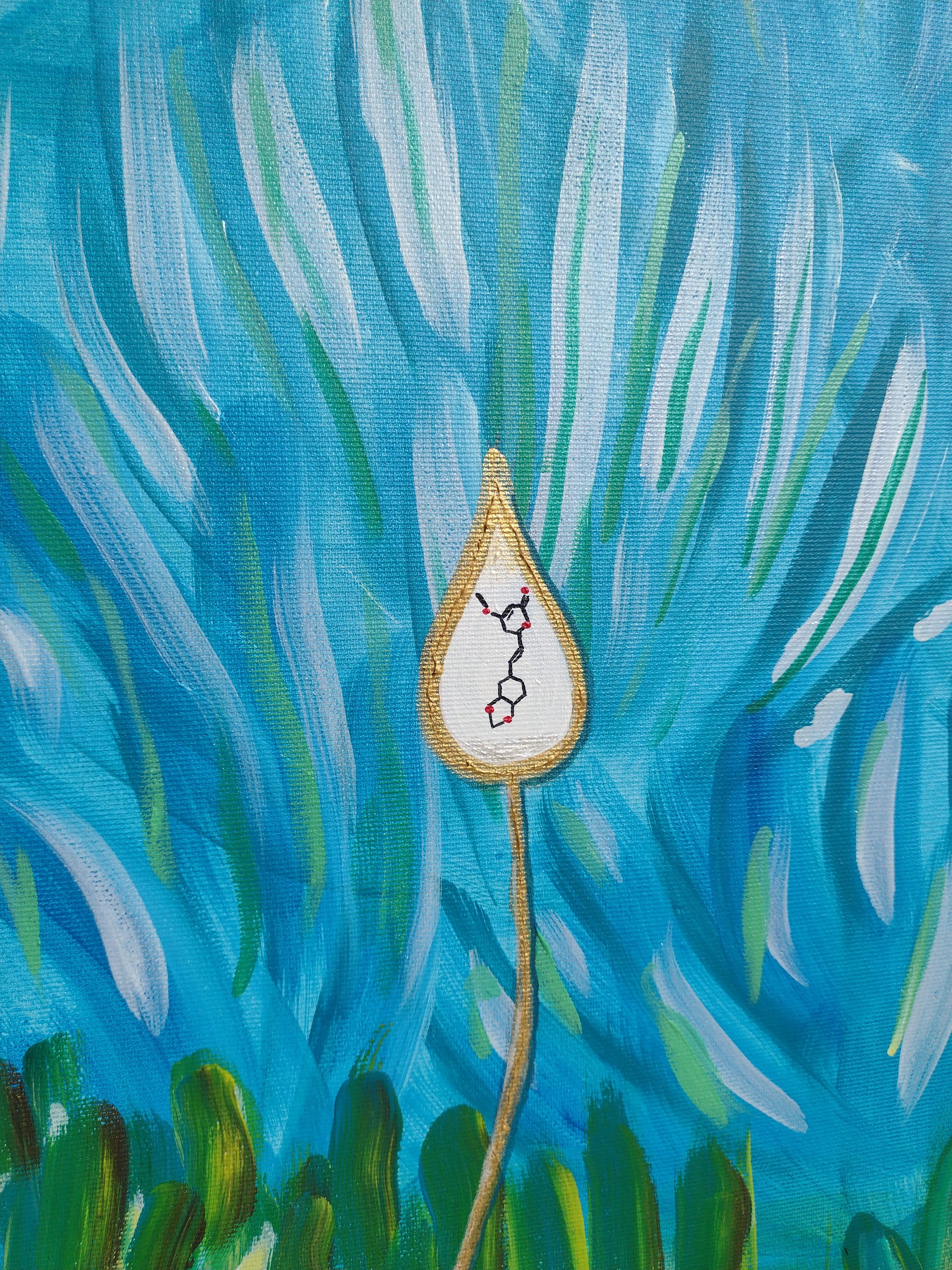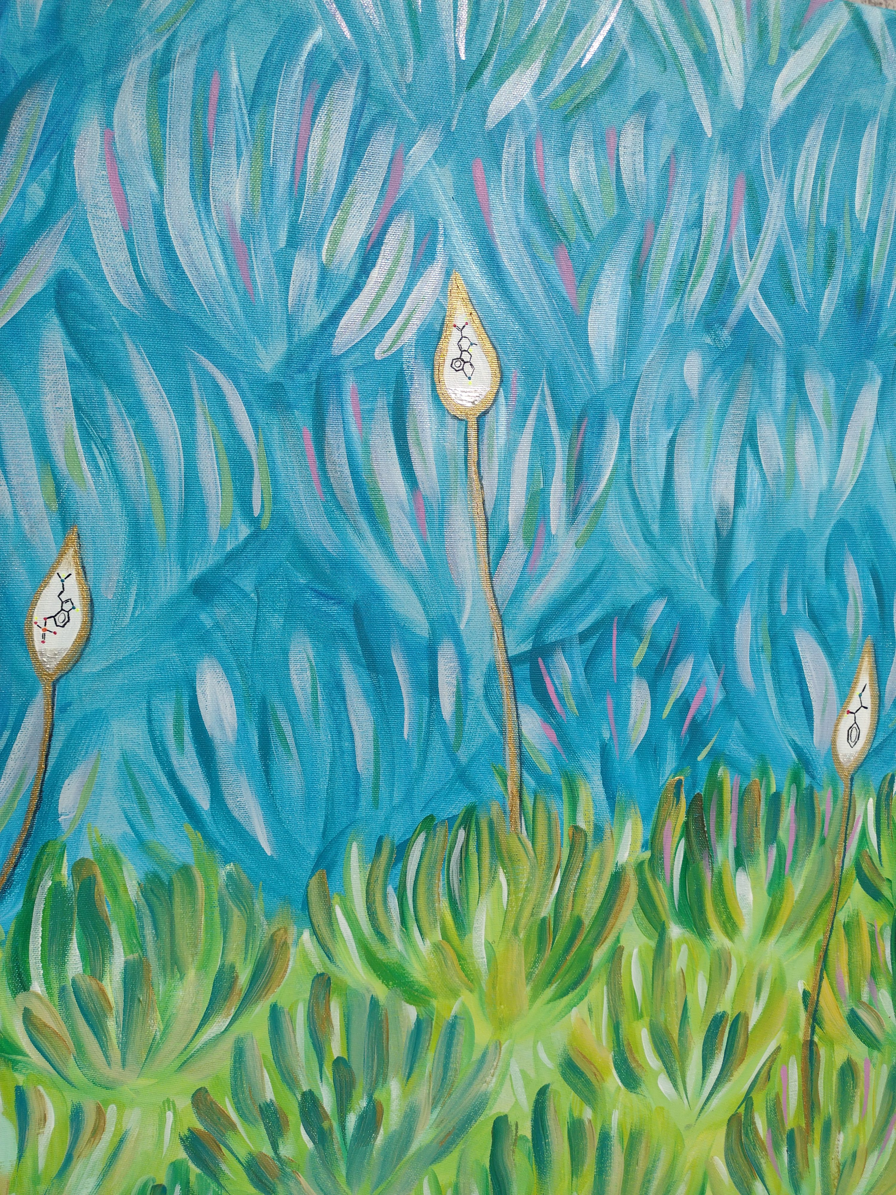 Flowers here depict molecules of entheogens that have shaped human history, many of them molecular keys binding to serotonin receptors. In some cases, for example the chosen K-opioid receptor agonists, the plants these molecules derive from are known to be unviable without human cultivation. Thus the topic of human interaction with the pharmacology of our natural habitat is mentioned through the choice of molecules, enhanced by their placement on the painting according to their location of use among societies across the world. As the topic of this painting touches on the spiritual aspect of medicinal plants and the cultivation of our spirit, great care has been taken to obscure it from the casual viewer, who occupies position 9 in the painting. The intention is for this viewer to be considered as part of the painting, exposing the molecular symphony that gives rise to his mind.